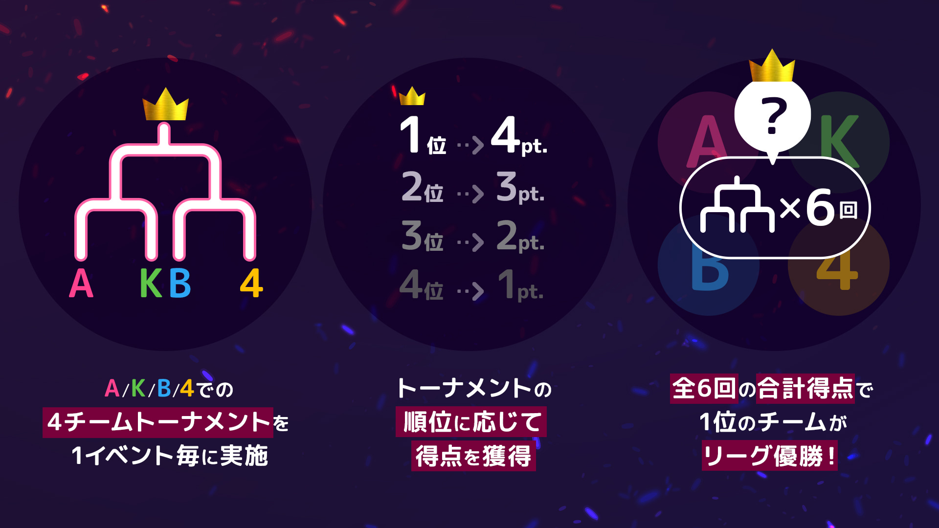 Le championnat s'est déroulé sur six journées, chacune a été l'occasion d'un mini tournoi entre les Teams A, K, B et 4. A l'issue de chaque journée, chaque Team reçoit des points en fonction de ses résultats :