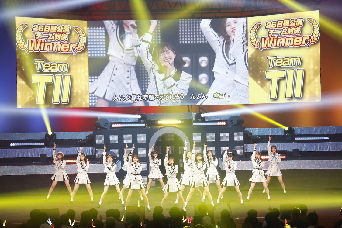 En remportant les concours de performances de l'avant veille, les Team TII et Team KIV ont reçu le privilège d'ouvrir la dernière journée de concerts. La première partie s'est déroulée avec une série de duos où les membres ainées de HKT48 semblaient transmettre le relais a leur cadettes. Ainsi Motomura aoi de la première génération passait le témoin de danse à Takemoto Kurumi; de même Yabuki Nako remettait la responsabilité du chant à Mogami Nanaka.